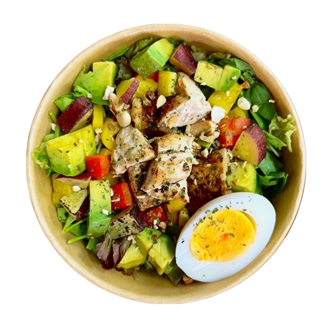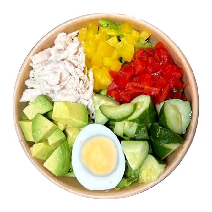 saladchicken.avocado.egg.cucumber.bell pepper.brown rice