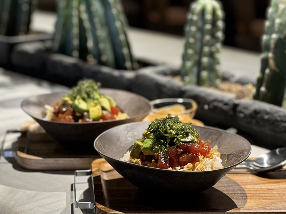 北海道・利尻から直送した、サーモンを贅沢に使用。 海ぶどうは宮古島産でぷりぷりです。