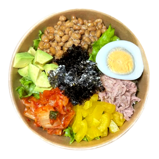 tuna.avocado.egg.kimchi.natto.korean seaweed.pickled radish.brown rice