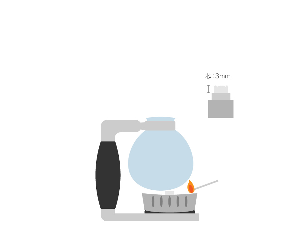 杯数に合わせてお湯または水を下ボールに注ぎ、アルコールランプに火をつけます。アルコールランプは下ボールの中心に置いてください。また、炎が下ボールの底から外に出ないようにしてください。綿芯は火口より3mm程度です。